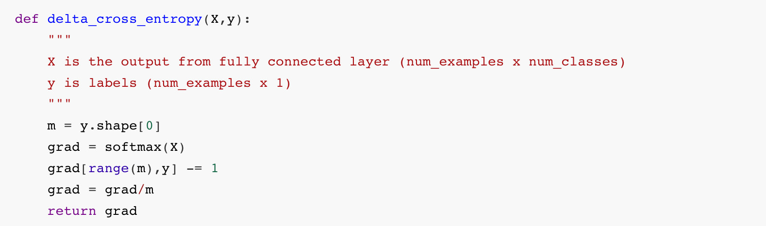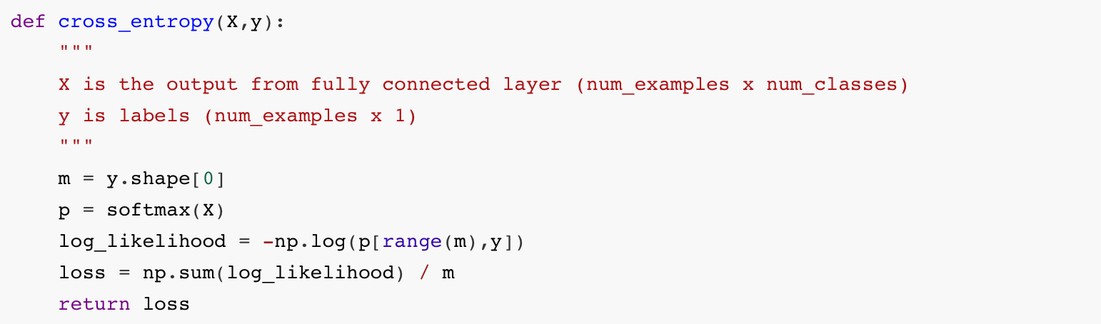 在分类问题中,交叉熵函数已经大范围的代替了均方误差函数。也就是说,在输出为概率分布的情况下,就可以使用交叉熵函数作为理想与现实的度量。这也就是为什么它可以作为有 Softmax 函数激活的神经网络的损失函数。我们来看一下,在 Python 中是如何实现交叉熵函数的: