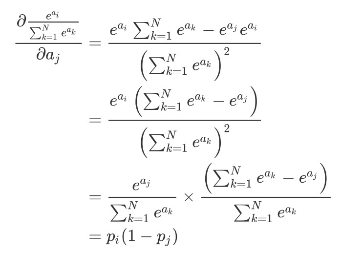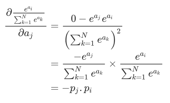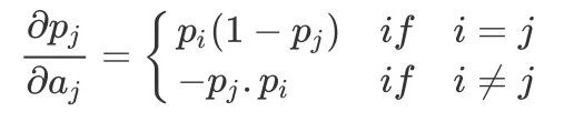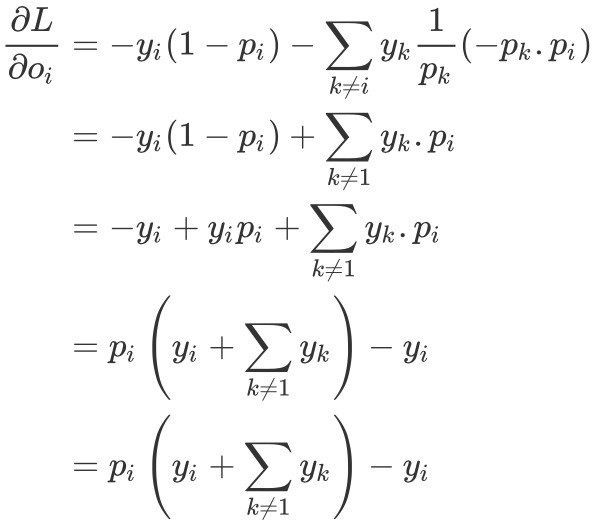 就像我们之前所说的,Softmax 函数和交叉熵损失函数是一对好兄弟,我们用上之前推导 Softmax 函数导数的结论,配合求导交叉熵函数的导数: