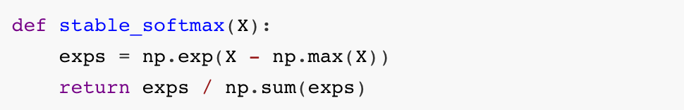 ,通过这种方法就使得原本非常大的指数结果变成0,避免出现 nan的情况。同样使用 Python,改进以后的 Softmax 函数可以这样写: