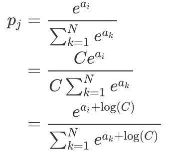 。对于指数函数来说,这个限制很容易就会被打破,如果这种情况发生了 python 便会返回 nan。为了让 Softmax 函数在数值计算层面更加稳定,避免它的输出出现 nan这种情况,一个很简单的方法就是对输入向量做一步归一化操作,仅仅需要在分子和分母上同乘一个常数 C,如下面的式子所示