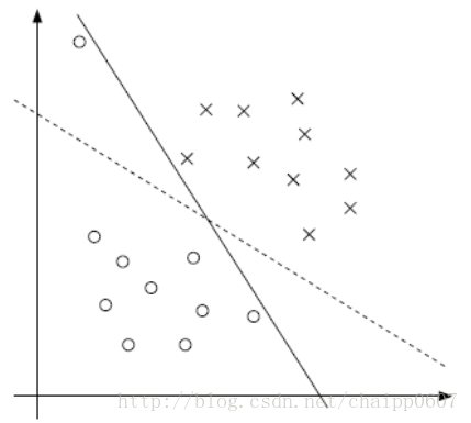 实线的决策平面分开了所有的正负样本,但是造成的结果是最大分类间隔非常小,而虚线虽然没有完全区分开所有的正负样本,但是保证了分类间隔更大,这个例子可以说明,不一定实线完全分类的决策平面就是最好的。