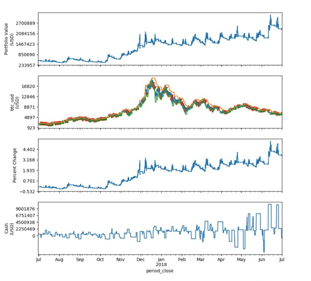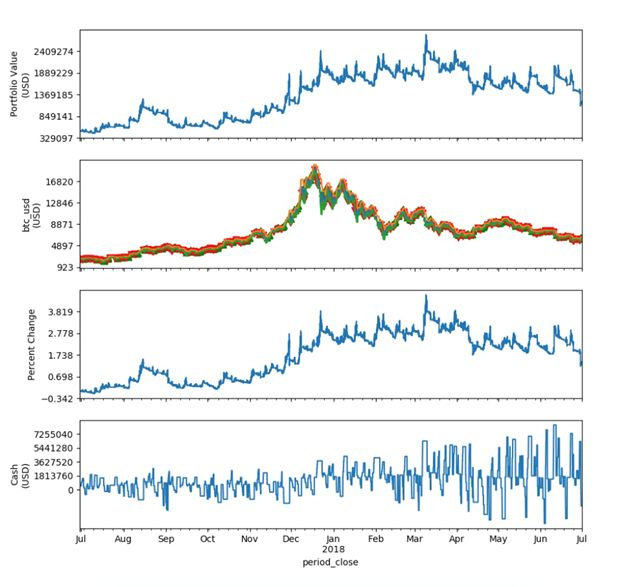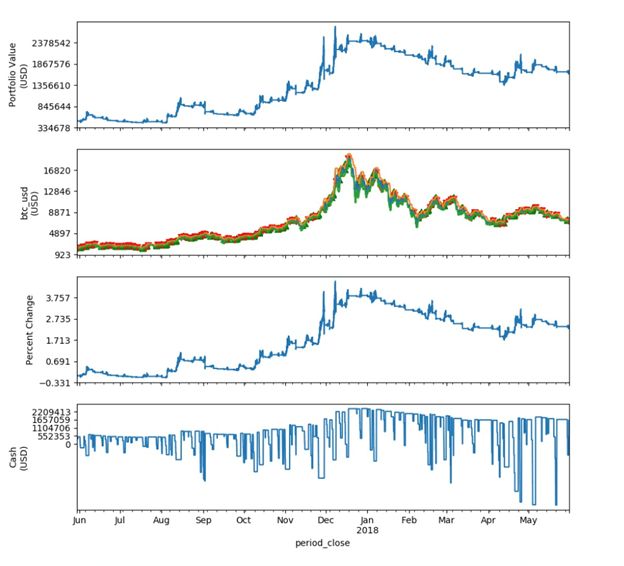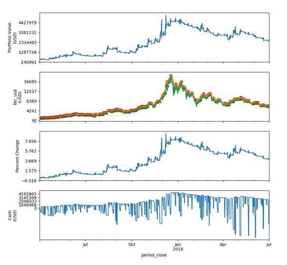 为了测试海龟交易法则在数字资产行业的实战效果,我们使用catalyst这个开源项目作为回测平台。并且使用bitfinex的从2017年6月30日到2018年6月30日的分钟级的交易数据进行回测。虽然回测的时间不长,但包含了完整的一个牛熊周期。BTC的期间波动率明显高于商品期货及股票,并且由于其是24小时交易,1年的交易数据可以满足我们的测试需求。