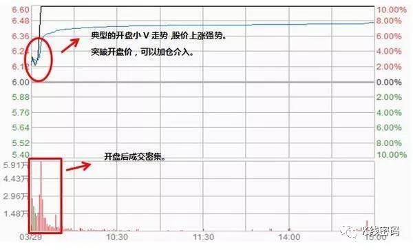 2、早晨开盘后,分时走势稳步向上,成交量迅速的放大.实战中,这类股票往往是高开后快速回调,然后再上涨,呈现一个小V的走势,当第二次上涨突破开盘高点时,投资者可以适当的加仓: