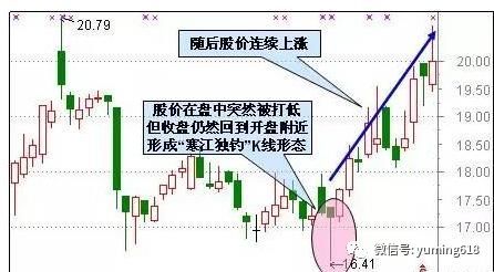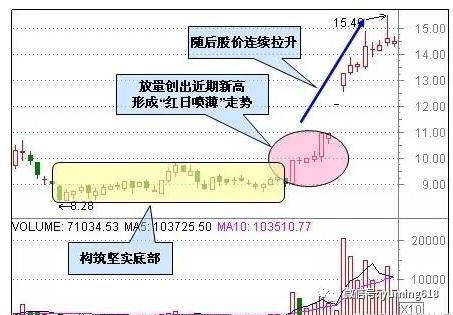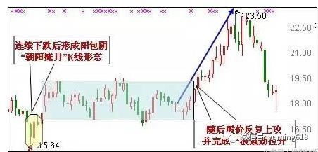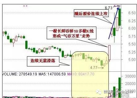 此种形态的股票的股价在低位持续小幅无量滑落,当某一日正常开盘后却拔地而起,报收大阳线,并且吃掉前期近10根K线,成交量也放出巨量。这表明往往是受某些突发性消息的刺激,主力机构急忙抄底的表现。