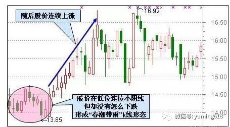 此种形态的股价在低位连日高开低走,并拉出多条小阴线,给人恐惧的感觉,但实际上并未下跌多少,甚至反而有所上升,这往往是股价见底的重要图形之一,投资者一定要记住。