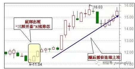 股价在经过较长时间的低位整理后,连续走出三根小阳线,形成“红三兵”走势,这是一波行情启动的信号。此K线组合的三根小阳线的收盘价逐日向上移动,且多半属于当天的较高价格为,武士勇往直前的形象跃然纸上,底部趋升的形式甚为明显,故称“三阳开泰”。