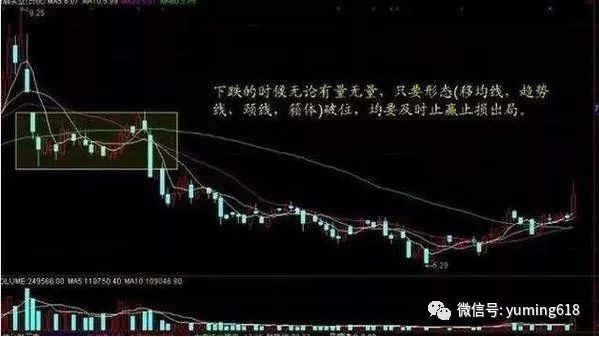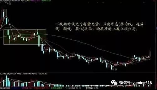 下跌的时候无论有量无量,只要形态(移均线,趋势线,颈线,箱体)破位,均要及时止赢止损出局。