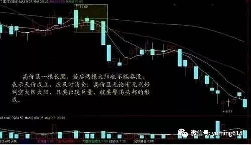 高价区一根长黑,若后两根大阳也不能吞没,表示天价成立,应及时清仓;高价区无论有无利好利空大阴大阳,只要出现巨量,就要警惕头部的形成。