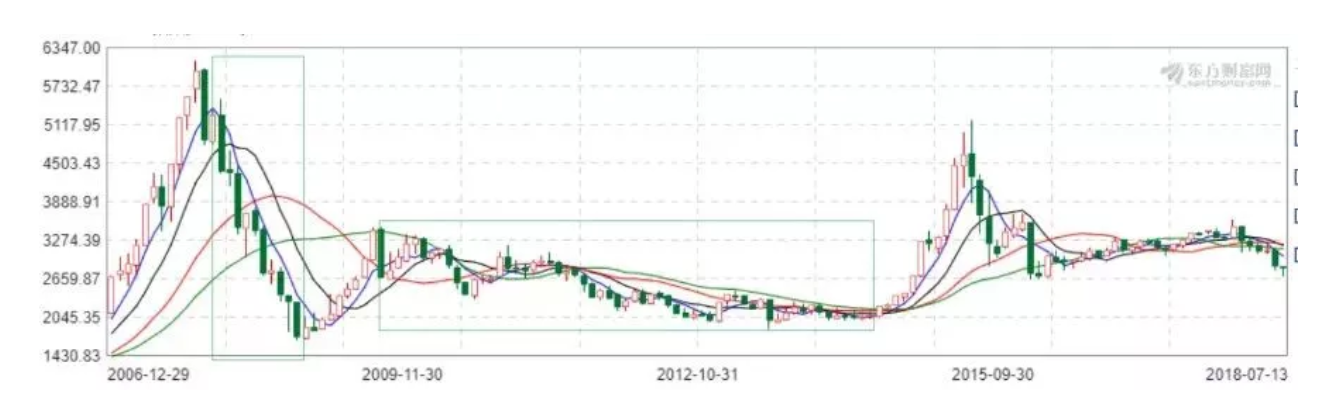 上上一波大牛市2007年见顶后,第一波从6124点,跌到1664点,用了12个月。但真正的熊市才刚刚开始,从2009年反弹的高点3478点,整整用了57个月,才来到下一轮牛市的起点2000点附近,跌幅只有前一波的一半,但延续的时间是前一波的近5倍。