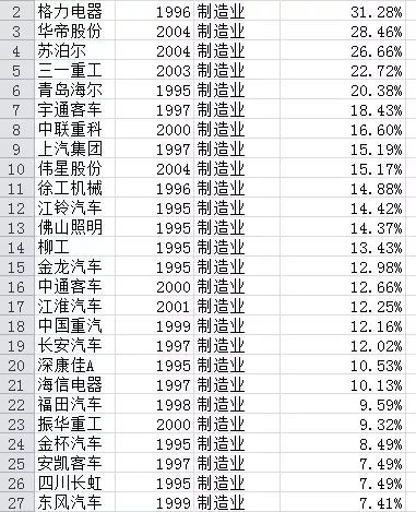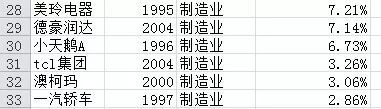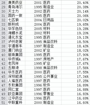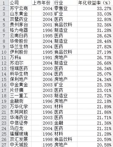 医药和食品饮料占比接近50%,这个和投资者未来里面介绍的美股情况较为吻合,说明医药和食品饮料是出现优秀公司的温床,需要我们投资者加以关注,未来这两个板块仍是重点。制造业在中国过去20年也创造出了很多优秀的公司,未来这个领域也值得我们重点关注,毕竟美国的通用电气,通用汽车,日本的家电和汽车业回报率也不错。第一名苏宁云商给我们揭示了一些信息,零售业也会经常出现回报率很高的公司,比如美国的沃尔玛,好市多等,因此这块也是值得我们花些时间,但难度较大。