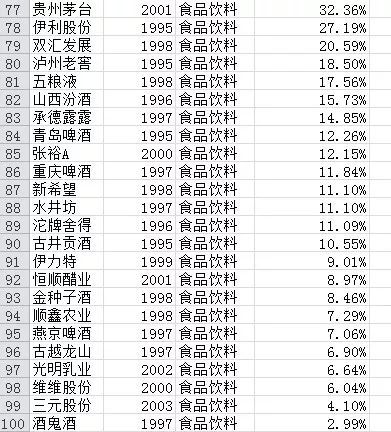 这个表格里面有很多2003-2004年上市的公司,回报率占了一些优势,因为2003-2005年a股的估值非常低,这个时间点买入会有估值和业绩的双击,这也是需要考虑进去的因素。很多人可能没有想到银行的落选,后续会专门介绍。可以说中国和美国的回报率排名有类似的地方也有一些不同的地方,中国的制造业板块可能会出现不错的公司,因为美国后来更重视服务业发展,互联网板块以后可能会出现回报率较高的公司,美国已经开始呈现出一些现象。似乎对未来a股的重点研究方向应该集中在4个方面:医药,制造业,食品饮料,互联网。