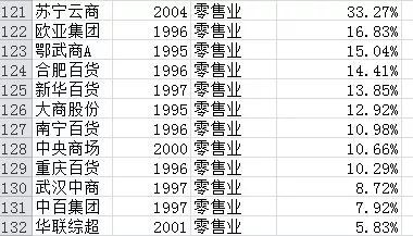 零售业的整体回报看似还不错,特别低的较少,大部分都在10%以上,如果要取得较高的回报率,还是需要连锁类型的,否则只能居于自己的区域很难有超额的回报,国内的的部分零售业都是百货店,且集中在自己的省份,只有苏宁算是真正全国意义上的连锁企业。