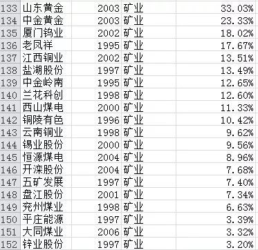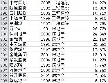 由于a股上市时间较短,为了使数据能更多的反映长期收益率指标,我尽量选取了上海a股代码601000之前的所有公司,深圳主板的公司以及中小板前100家公司,这样除了少量是2004年以后上市的公司,大部分都是上市超过15年的公司,公司总数233家,集中在几块比较重要的行业:制造业(包括家电,汽车,工程机械等),医药(包括西医,中医,医疗器械等),通信业,日用品,食品饮料(这块由于比较特殊从日用品单独拿出来),软件,能源,旅游,零售业,矿业,金融,交通运输(包括机场,高速公路,航空业,港口等),公共事业,工程建设,房地产,材料(包括水泥,钢铁,化工,纺织等)。
