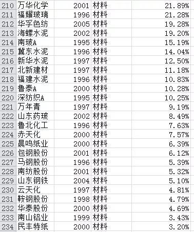 矿业类出了几个收益率较高的公司,其中有三家是黄金股,其他类别的表现相对较差且平淡,都说买黄金抗通胀,我看还不如买黄金股。材料类里面钢铁公司和化工公司普遍表现较差,而水泥公司表现较好,前几天和一些人讨论,主要原因是钢铁重量重价格高,水泥重量重价格低,这样运费就是一个很重要的因素,因此钢铁面临的是全国性竞争,而水泥是区域性的,水泥表现肯定要更好一些。材料头两名,一个是MDI生产者,国内基本就此一家,福耀玻璃在汽车玻璃领域也是全球前三,据说目前已经做到了第一。