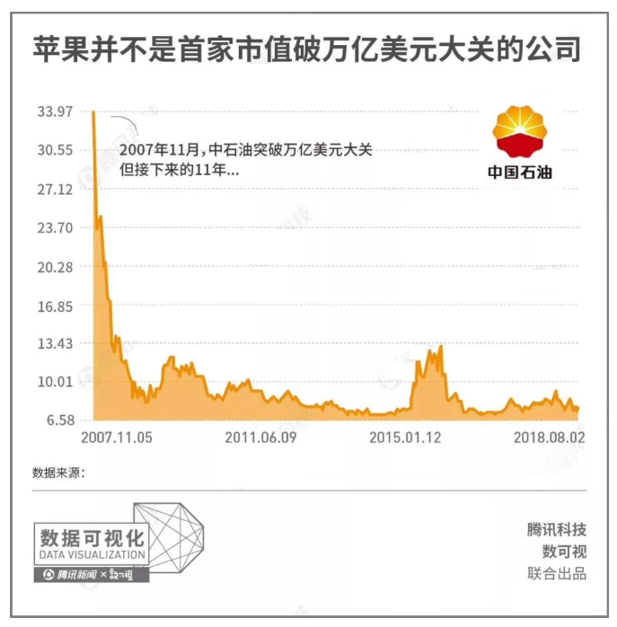 事实上苹果并不是历史第一个突破万亿市值的上市公司。如果说历史上曾经真的有一家企业市值有一瞬间触及过万亿美元,那就是中国石油巨头中石油。