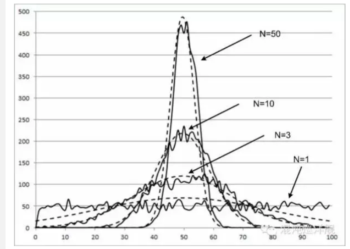 图5:大数定律,我们看到随着样本总数N的增加,钟形曲线越来越瘦(对平均数的偏离减小),如过你想象一下N无限大,我们就得到一根竖线–代表我们以任意精度得到平均数,不确定性被消除。