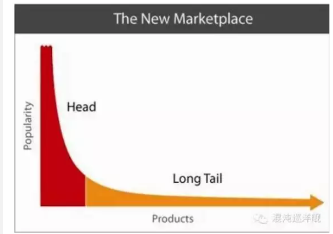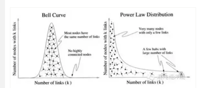 图5:幂律分布与高斯分布的对比,幂律分布最显著的特征是它的长尾,表示那些在高斯分布下的微小概率事件并非那样罕见。