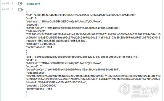 使用listunspent,结果如图(图6地址上的交易信息):