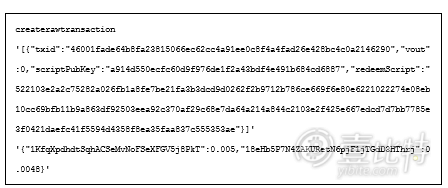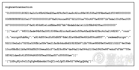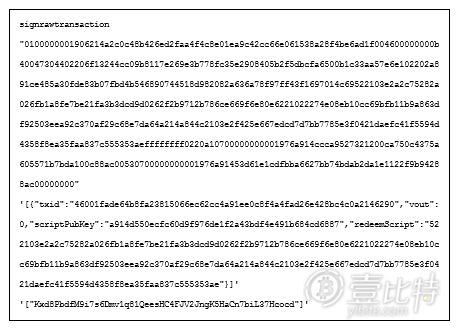 命令的第一个参数,就是createrawtransaction的输出。第二个关于txid的参数,与上面的相同。最后一个参数,是私钥,我们用的是管理者1的私钥。
