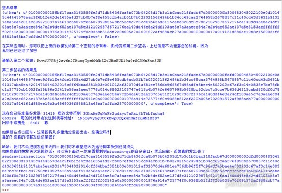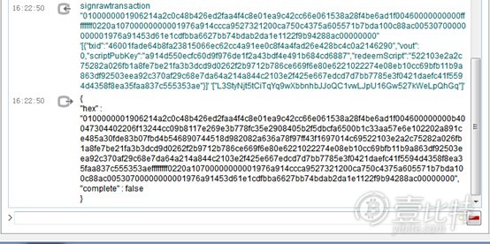 可以注意到complete字段是false,因为我们只用了一个私钥签名。然后,将输出的hex字段取出,用第二个私钥再次签名。