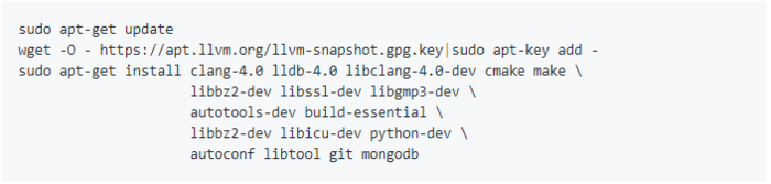 sudo apt-get install clang-4.0 lldb-4.0 libclang-4.0-dev cmake make