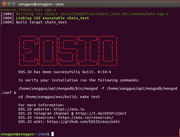 8、构建EOS非常耗时(1小时以上),当你看到红色的“EOSIO”时,表示构建成功。