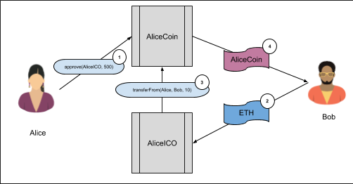 对于 approve & transferFrom 工作流程,需要两个交易。假设Alice希望允许AliceICO合同将所有AliceCoin Token的50%卖给像Bob和Charlie这样的买方。首先,Alice发布AliceCoin ERC20合同,将所有AliceCoin发放到她自己的地址。然后,Alice发布可以以ether出售Token的AliceICO合同。接下来,Alice启动+approve & transferFrom+工作流程。她向AliceCoin发送一个交易,调用+approve+,参数是AliceICO的地址和+totalSupply+的50%。这将触发+Approval+事件。现在,AliceICO合同可以出售AliceCoin了。