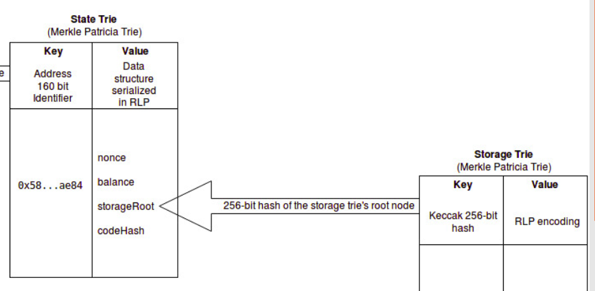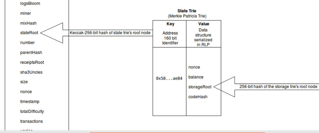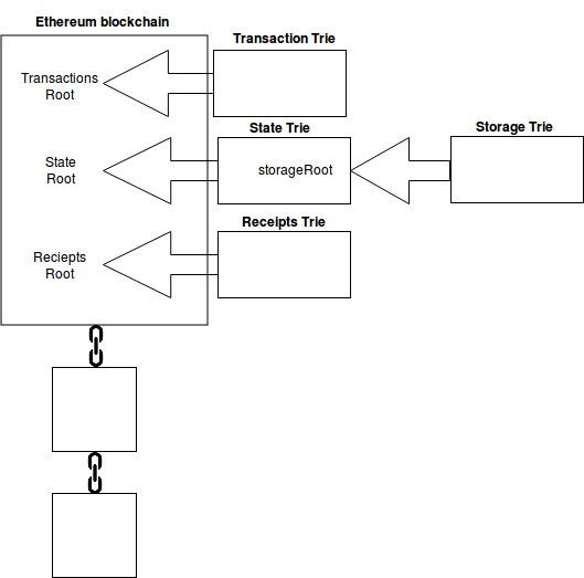 也许你也注意到了,从上面的图表中,存储树的根节点哈希(所有的智能合约数据存储在其中)其实都是指向状态树的,从而指向区块链。接下来,我们会讨论更多细节。