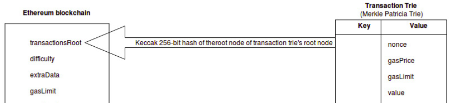 重要地是,例如账户余额之类的数据并不是直接存储在以太坊区块链的区块中。只有根节点哈希的转账,状态数据和回执数据是直接存储在区块链上的。可以根据下图看出。
