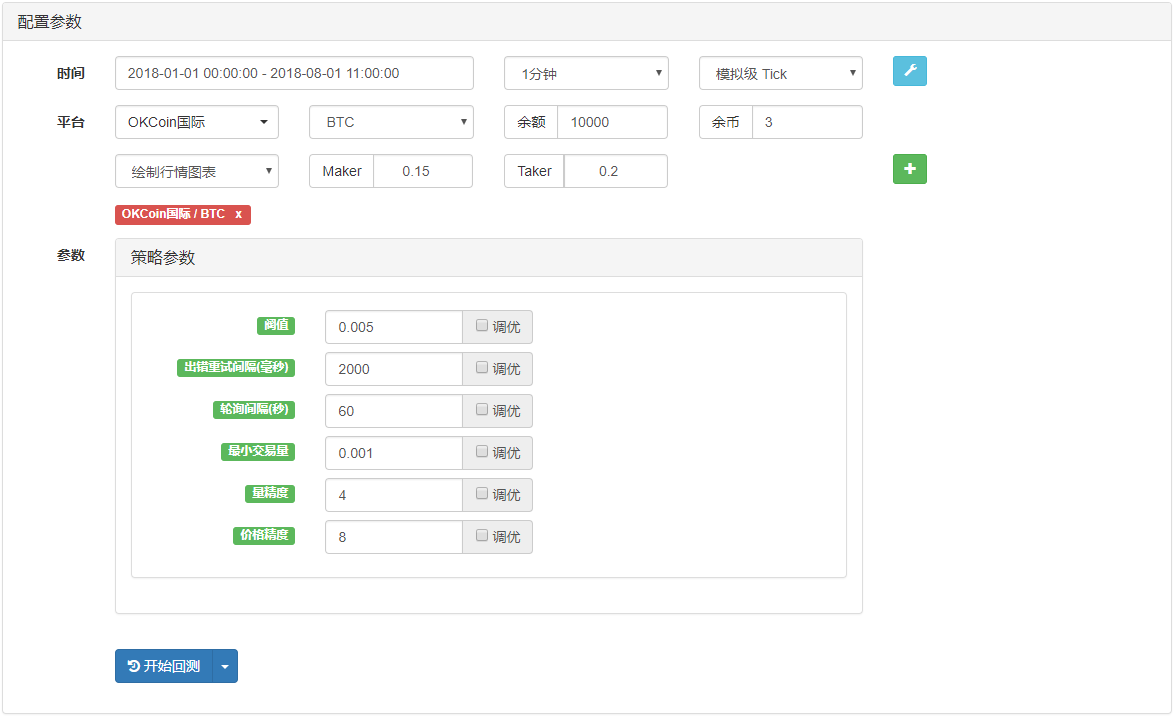 按照当前的 BTC 的价值,账户余额保留¥5000 现金和 0.1个 BTC,即现金和BTC 市值的初始比例是 1:1。