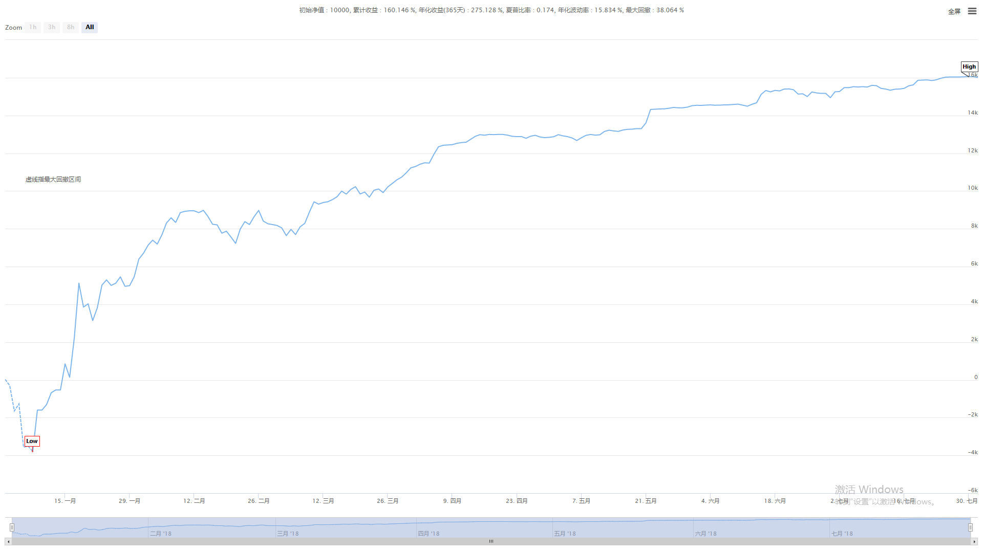 BTC 已经持续了长达 8 个月下跌,甚至最大跌幅超过70%,这造成很多投资者对区块链资产失去信心。本篇策略累计收益高达 160%,年化收益风险比超过 5。对于一个这么简单的投资策略,这个投资回报率已经超过绝大多数梭哈的群众了。