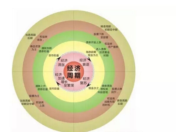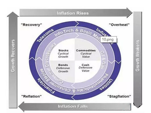 该理论将经济周期划分成四个阶段:衰退、复苏、过热和滞涨。在复苏周期,经济开始增长,同时保持较低的通胀水平,此时表现较好的资产为股票;在过热周期,经济增长开始放缓,同时通胀抬头,此时表现较好的资产为大宗商品;在滞涨周期,经济增长率降低至潜能之下,通胀继续上升,股票与债券的表现均不好,此时适合持有现金;在衰退阶段,经济开始衰退,通胀走低,此时表现最好的资产为债券。