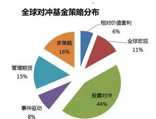 截止2015年7月底,全球采用各种策略的对冲基金占比如下图所示,其中占比最高的是股票对冲策略类,占比达44%;其次是多策略类,占比达16%;再次为管理期货类,占比达15%。类策略占据了所有对冲基金的半边江山。