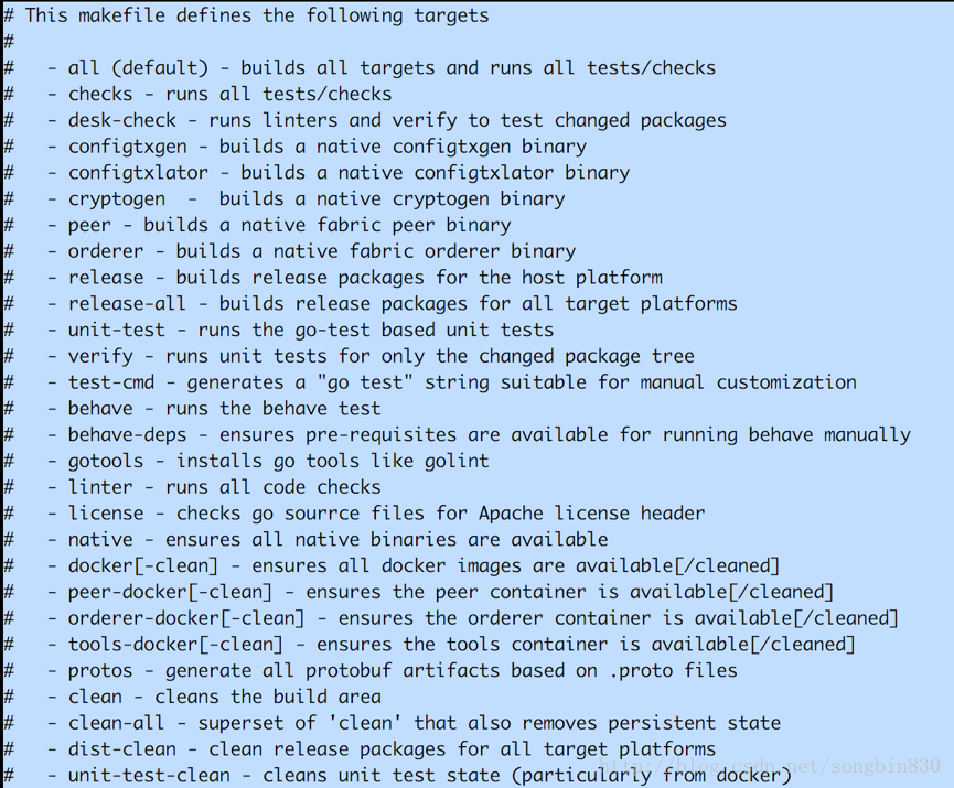 切换到 fabric 源码的目录下面,通过 makefile 文件,可以编译出 fabric 项目的全部可执行文件,如图: