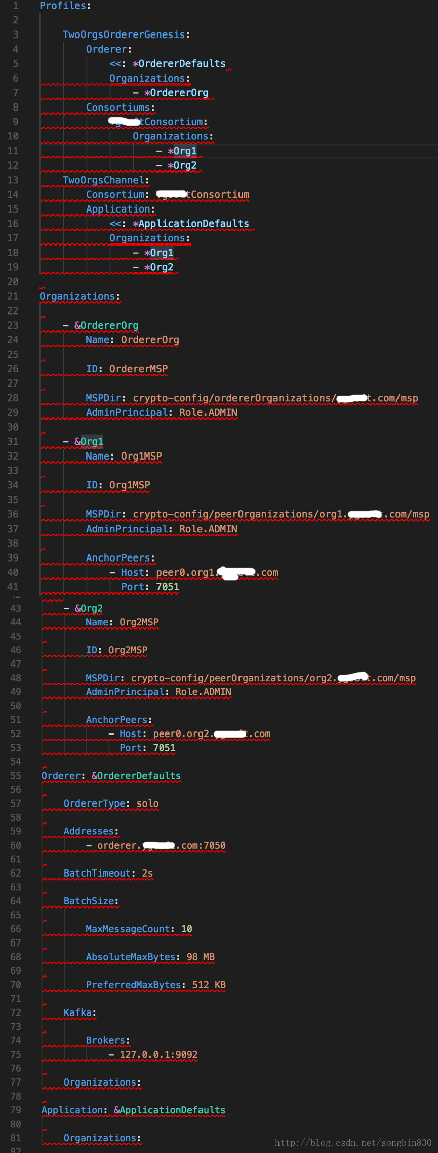 -通过配置文件 configtx.yaml 配置ordere 节点启动需要的创始区块信息,以及新建应用通道的交易信息。配置文件内容如下: