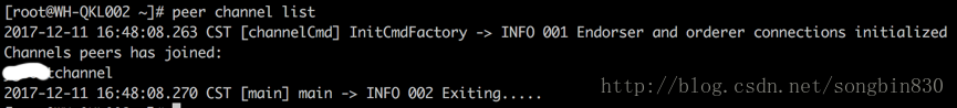 -加入应用通道的peer 节点虚拟机都可以通过终端命令查看加入的通过信息,如图: