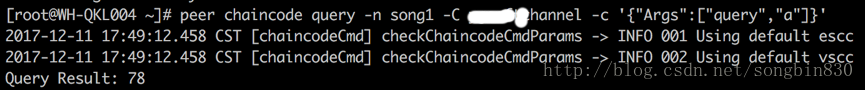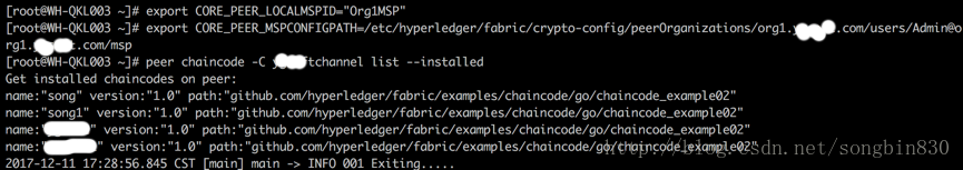 注意:这里进行测试的链码是 fabric 源码中的样例-p 指定的路径在命令执行的时候会自动根据 GOPATH 环境变量自动补全前缀,所以路径一个在 $GOPATH/src/目录下: