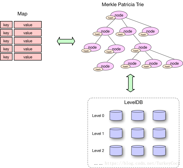 首先介绍一下MPT的存储流程,然后依次分析StateDB、Transactions、Receipts的存储,这3棵树的Merkle Root最终会存储到区块Header中的Root、TxHash、ReceiptHash字段。