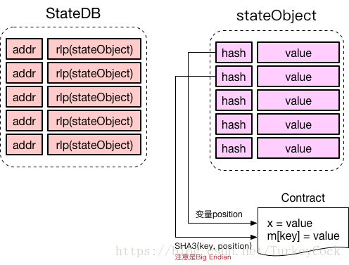 StateDB里的Trie以账户地址为key,存储经过RLP编码后的stateObject。