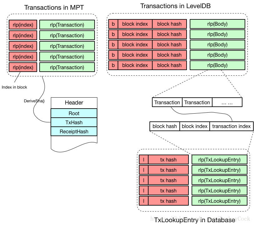 从图中可以看出,MPT中是以交易在区块中的索引的RLP编码作为key,存储交易数据的RLP编码。
