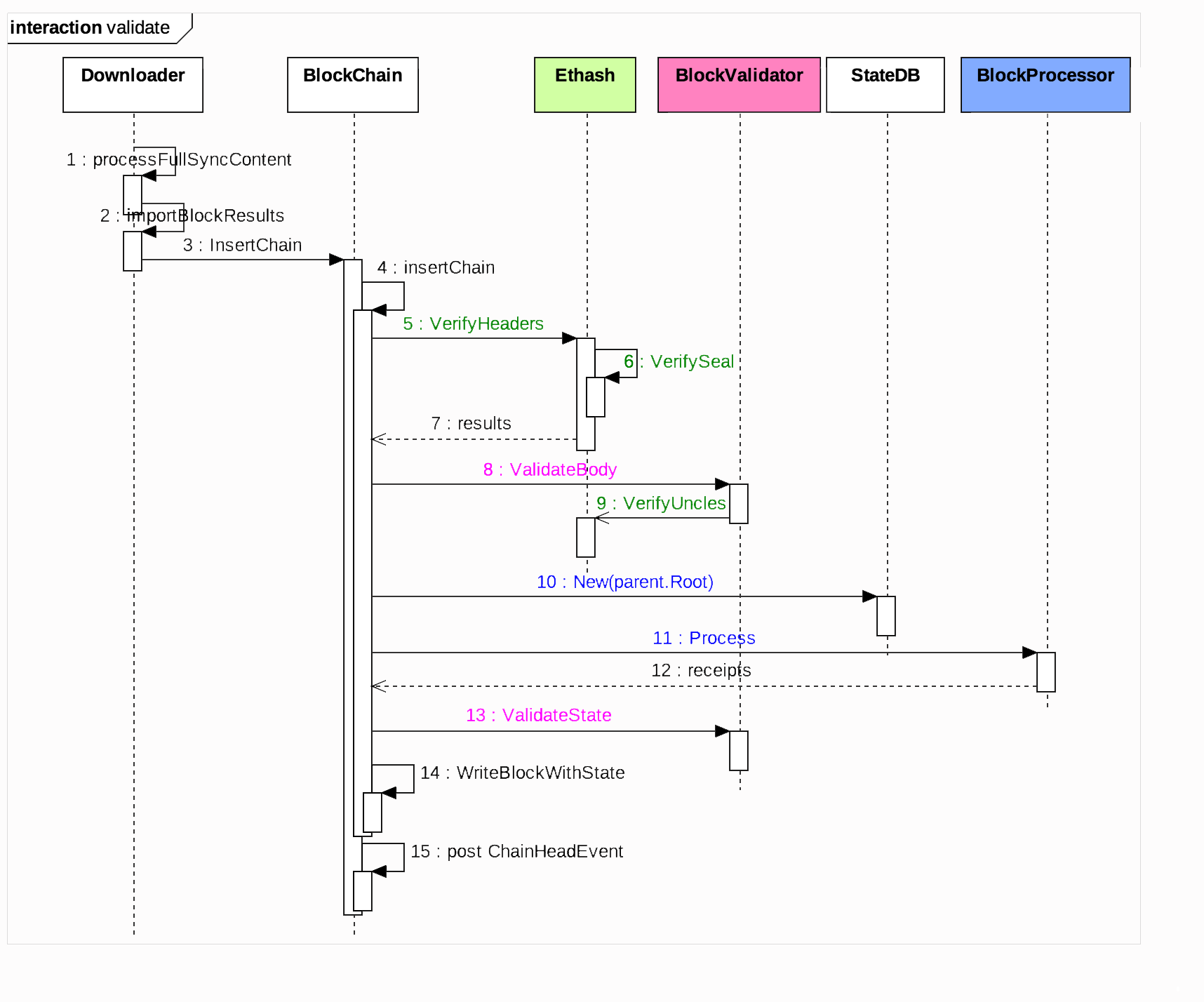 与区块验证相关联的还有2个外部接口:Processor用于执行交易,而Validator用于验证区块内容和状态。