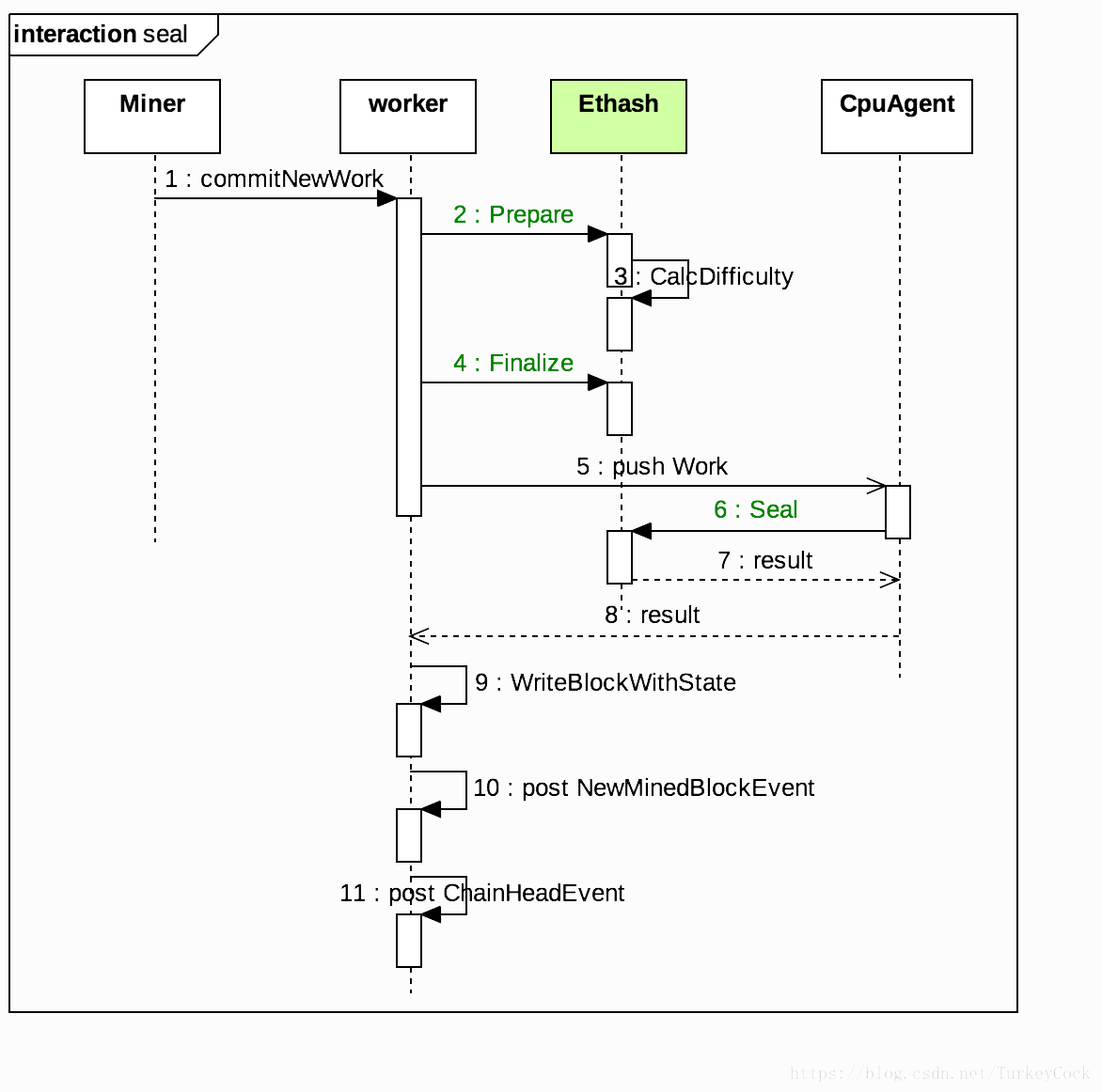 新产生的区块必须经过“盖章(seal)”才能成为有效区块,具体到Ethash来说,就是要执行POW计算以获得低于设定难度的nonce值。这个其实在之前的挖矿流程分析中已经接触过了,主要分为3个步骤: