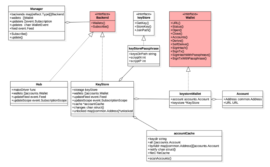 从图中可以看出wallet、account、address这三者的区别和联系i:wallet中可能包含多个account,而每个account中包含一个address和账户所在路径(URL)。