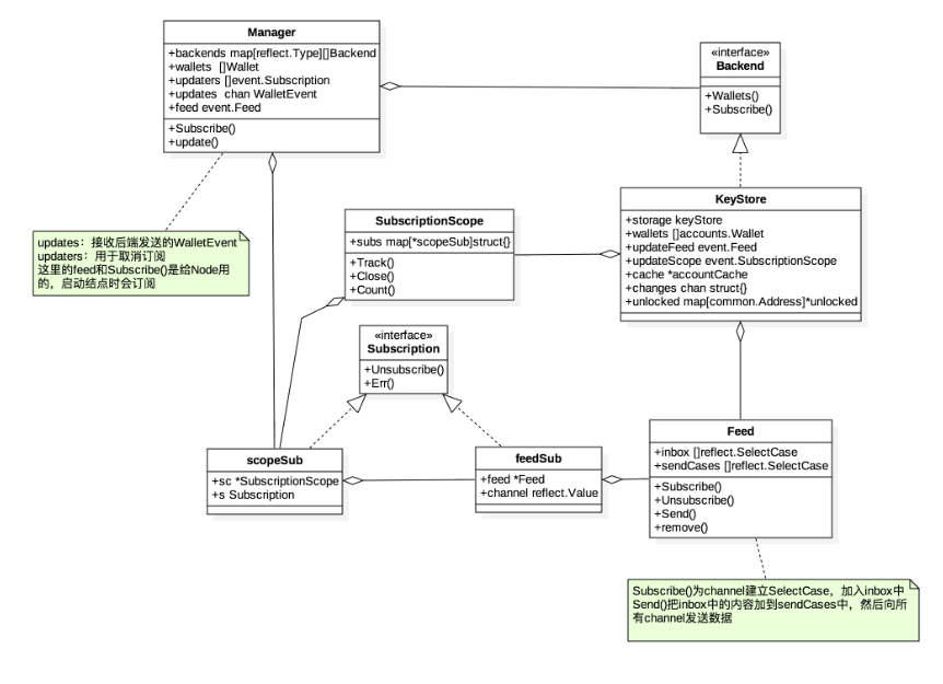 KeyStore作为后端的实现,会把这个注册请求转发给一个Feed类型的实例。Feed会把该channel记录在案,同时返回一个feedSub类型的实例,该类型实现了Subscription接口。最后,feedSub实例会被包装进一个scopeSub类型的wrapper中,返回给Manager,Manager可以通过该接口取消事件订阅。