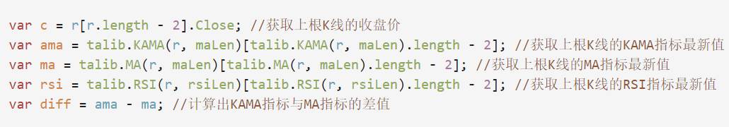 获取行情,计算KAMA指标、MA指标、RSI指标,根据指标值作为判断交易条件的依据。