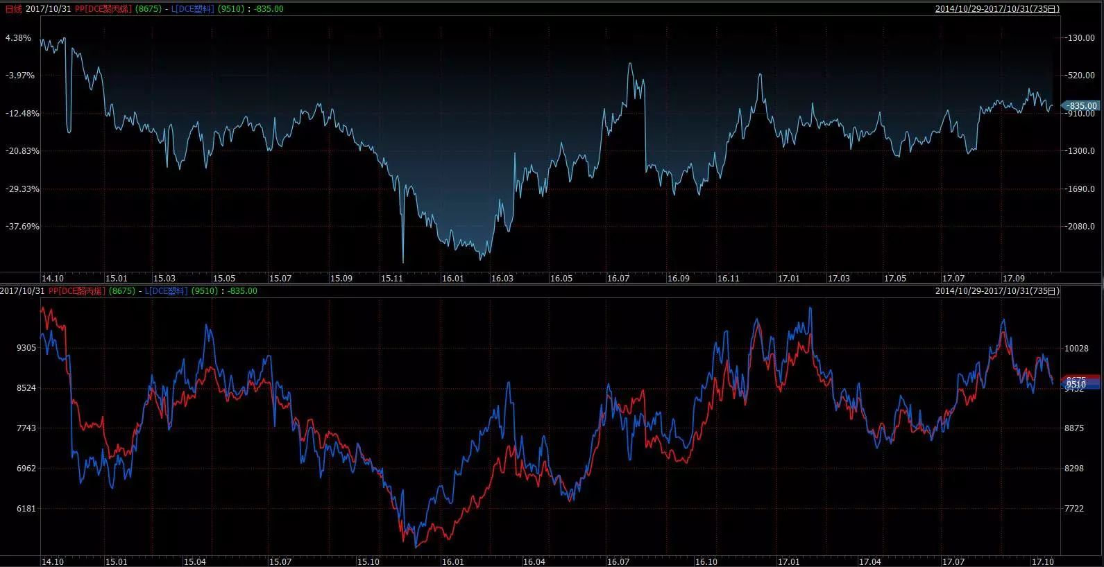 那么我们在使用网格策略的时候,会使用一种更为安全的方法。选择两个高相关度的期货合约,然后直接买卖其价差,尽管价差也可能会单边行情,但价差的波动率要比单个品种要稳定得多。