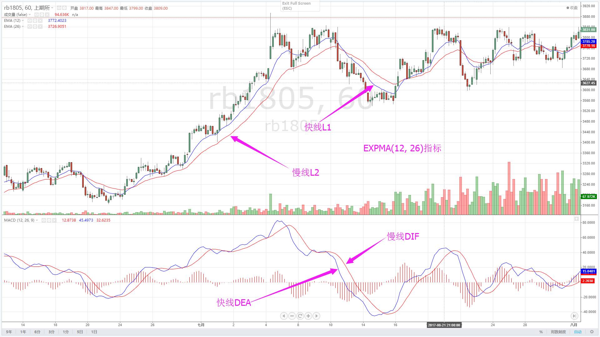 第1步:先对杂乱的K线均值处理,即EMA12和EMA26。均线的优点是比较稳定,但缺点是比较滞后、频繁发出无效信号。
