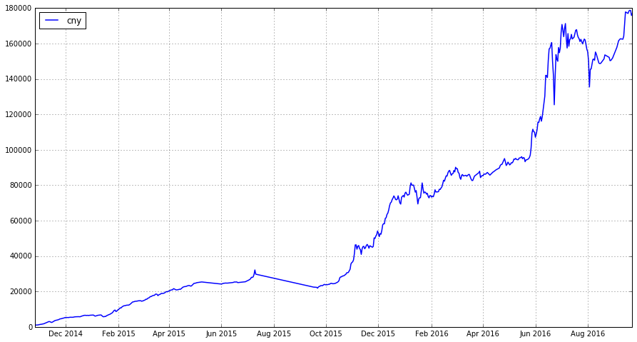 下图是我具体统计的OKcoin平台的收益曲线,初始资金1000元,可以看到初始钱稳定增加,中间的直线是我策略停止了,后期由于把策略全改为赚币策略,以人民币计价的收益波动剧烈,具体的过程在策略交易两年总结的文章里有描述。
