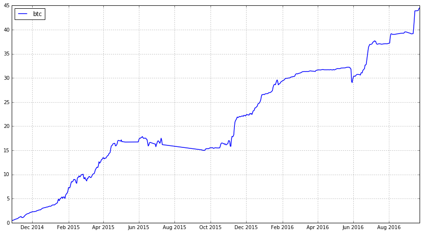 策略从2014年8月运行,直到今年年初交易所收手续费。期间运行的还算很好,亏损的时间很少。资金从最初的200元跑到了80比特币。具体的过程可以看小草的新浪博客里虚拟货币自动化交易之路系列文章。