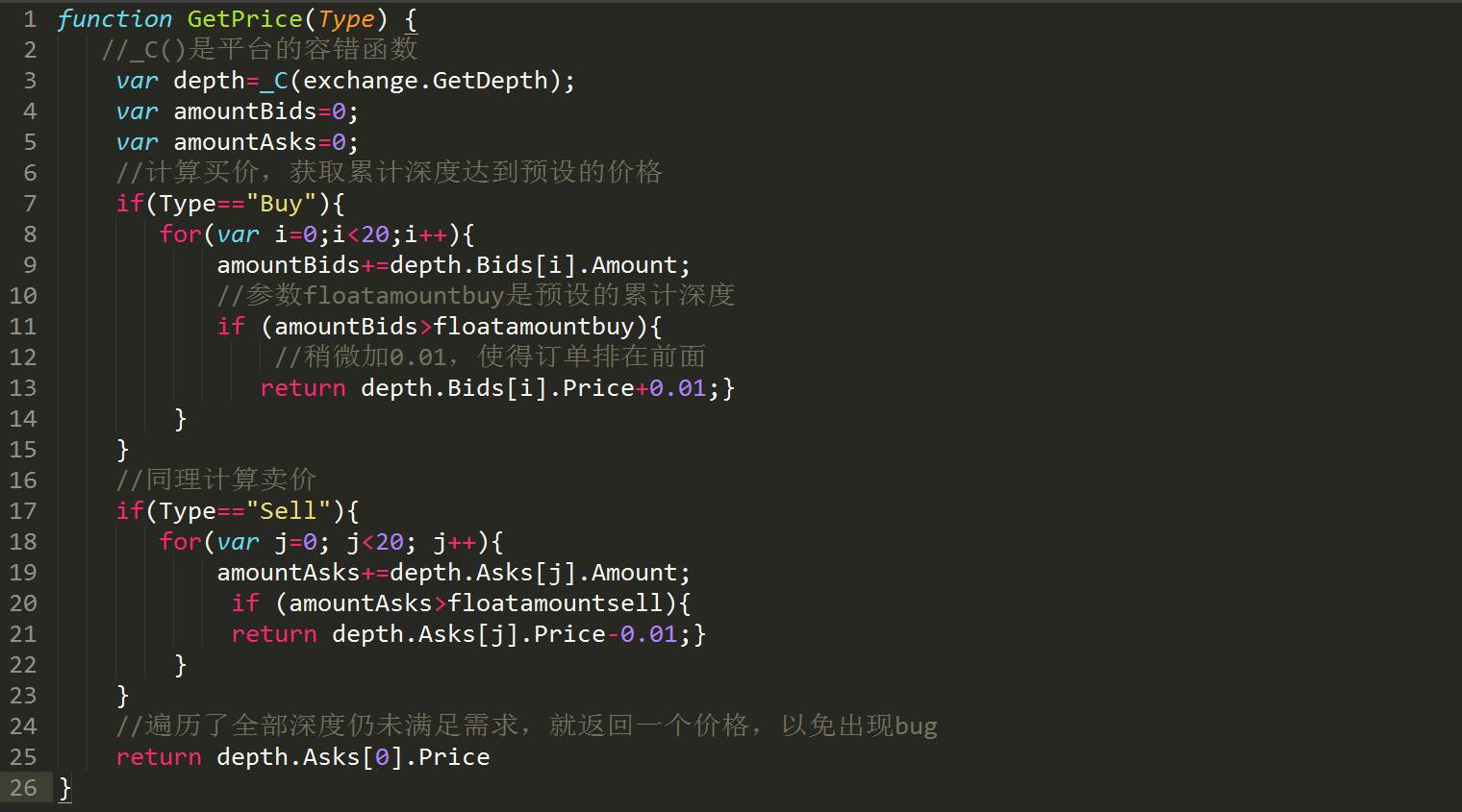 首先是获取买卖价函数GetPrice(),需要获取订单深度信息,注意不同平台的订单深度信息长度不同,以及即使遍历了所有订单仍然没有所需要的量的情况(在后期许多0.01的网格挂单会导致这种情况),调用是GetPrice('Buy')就是获取买价。